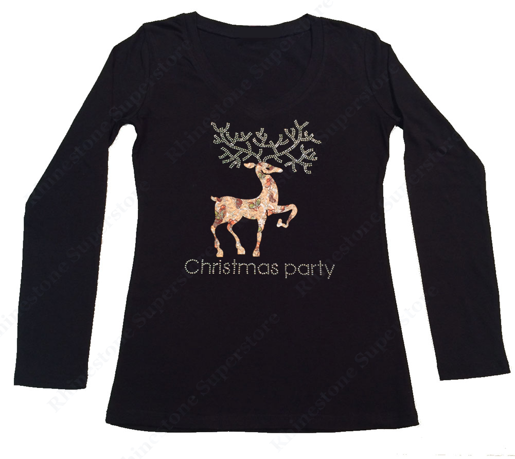 Womens T-shirt with Reindeer Christmas Party in Rhinestones and Material