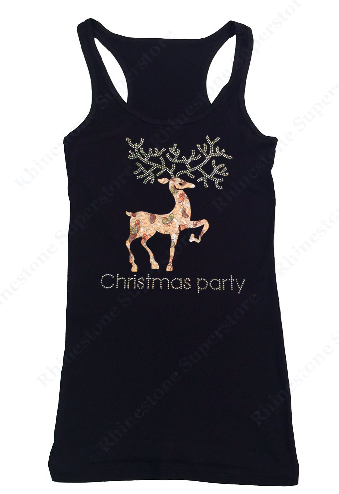 This is for New Women's Fitted T-Shirt embellished with “ Reindeer Christmas Party " made in Rhinestones and Materials with a choice of V-Neck in Cap Sleeve or Long Sleeve Styles or Ribbed Razorback Tank Top.