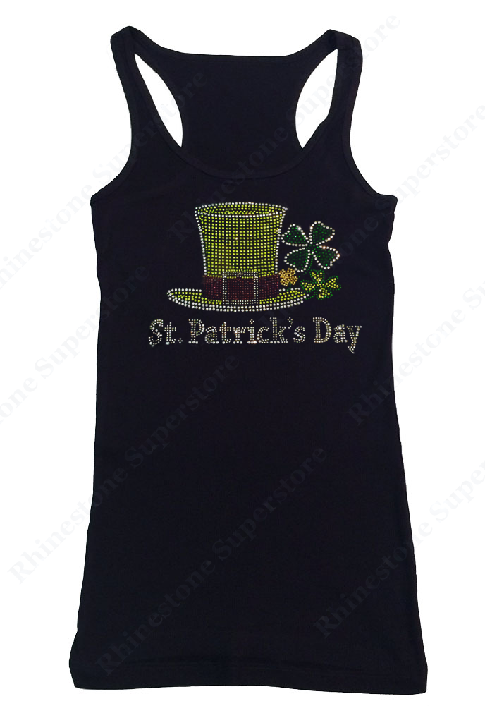 This is for New Women's Fitted T-Shirt embellished with “ Saint Patrick's Day Top Hat with Clover Leaves " made in Rhinestones with a choice of V-Neck in Cap Sleeve or Long Sleeve Styles or Ribbed Razorback Tank Top.