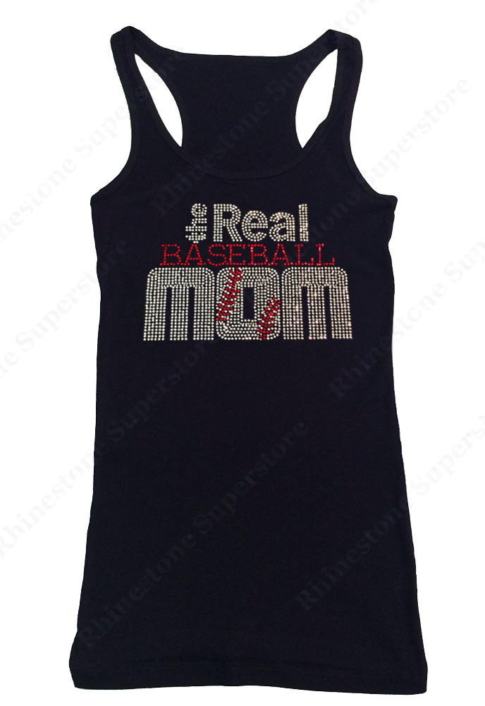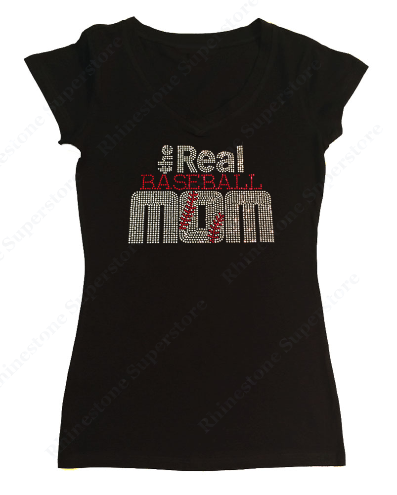 This is for New Women's Fitted T-Shirt embellished with “ The Real Baseball Mom " made in Rhinestones with a choice of V-Neck in Cap Sleeve or Long Sleeve Styles or Ribbed Razorback Tank Top.