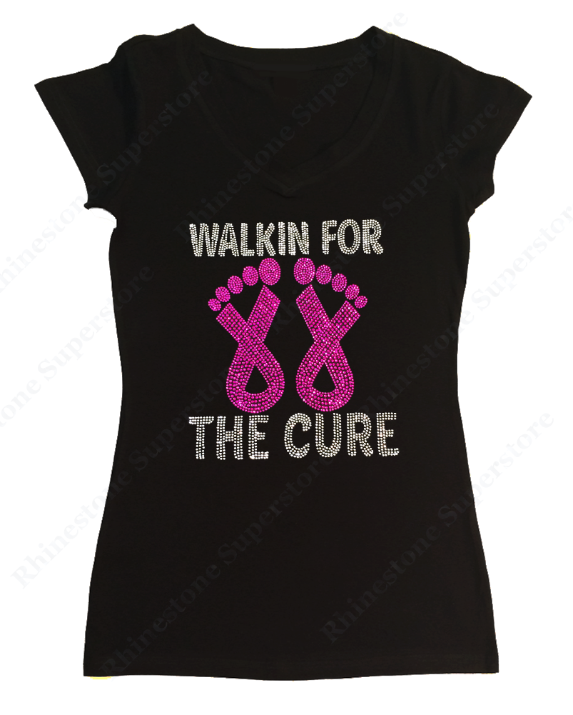 Womens T-shirt with Walk for the Cure Cancer Ribbons in Rhinestones