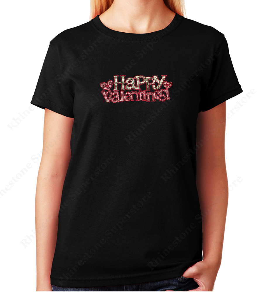 Women's / Unisex T-Shirt with Happy Valentines with Hearts in Rhinestones