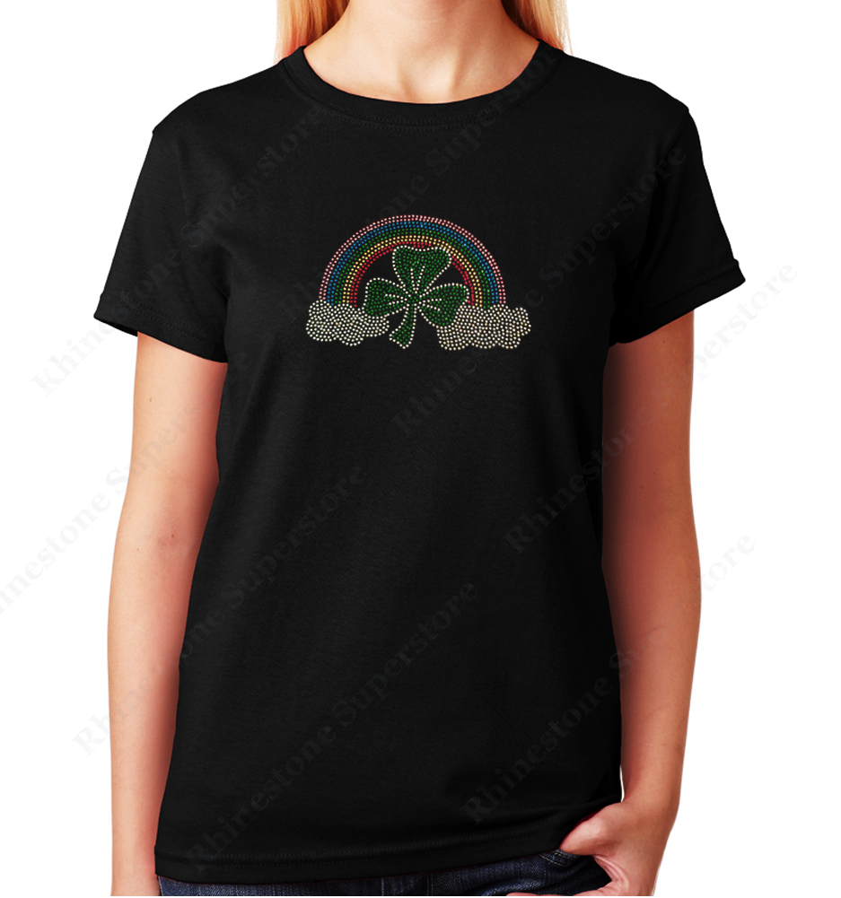 Women's / Unisex T-Shirt with Rainbow and Clover for St. Patrick's Day in Rhinestones