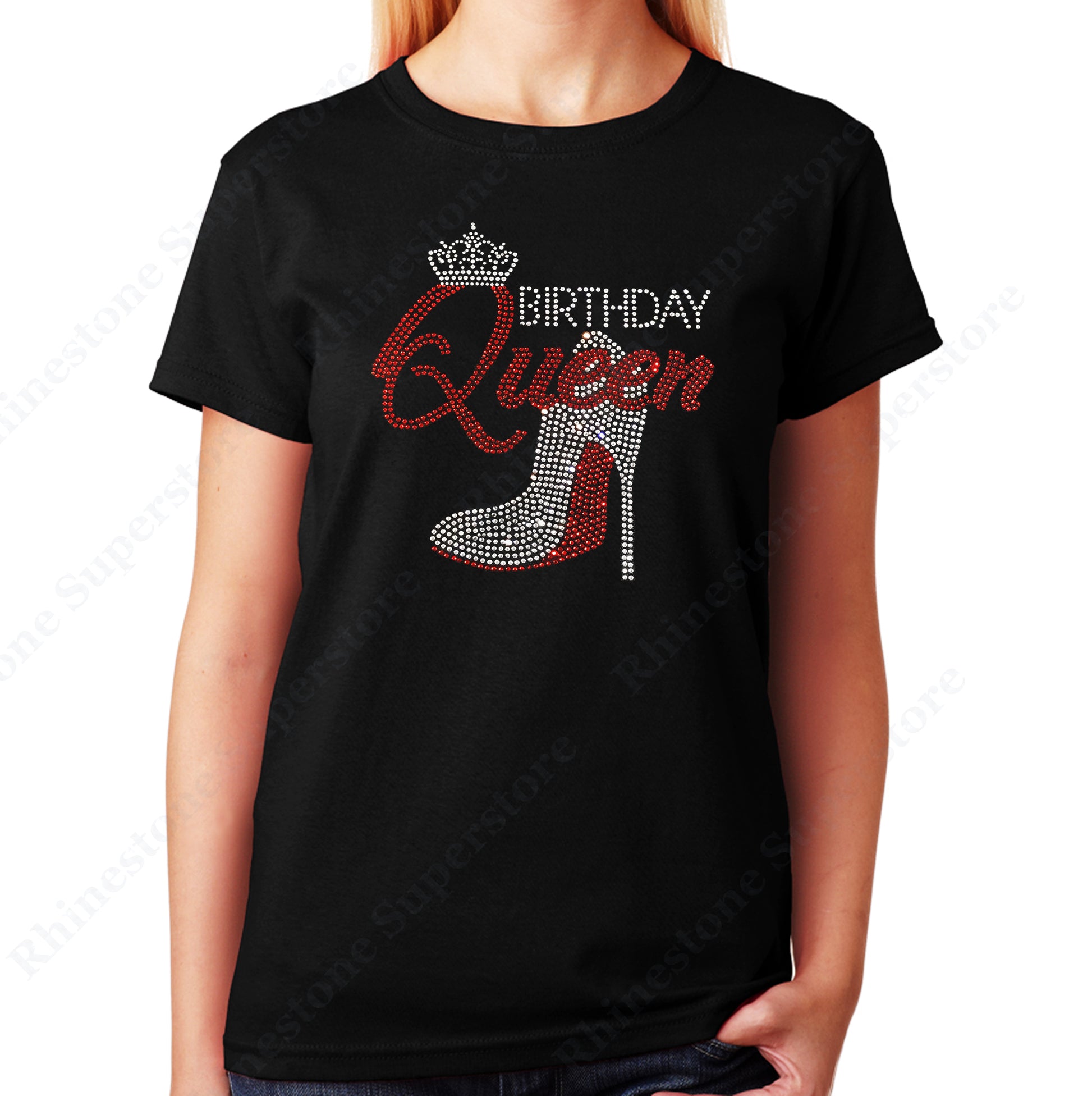 Women's / Unisex T-Shirt with Red Birthday Queen with Heel in Rhinestones